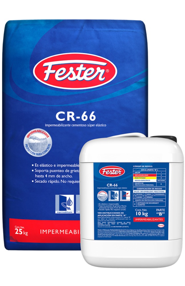 Impermeabilizante cementoso súper flexible, de dos componentes reforzado con fibras que al ser mezclados toman una consistencia cremosa, suave y fácil de aplicar. Ya seco FESTER CR-66 forma una capa impermeable, elástica y flexible que puede soportar movimiento de la superficie y proporciona excelente resistencia al puenteo de grietas.